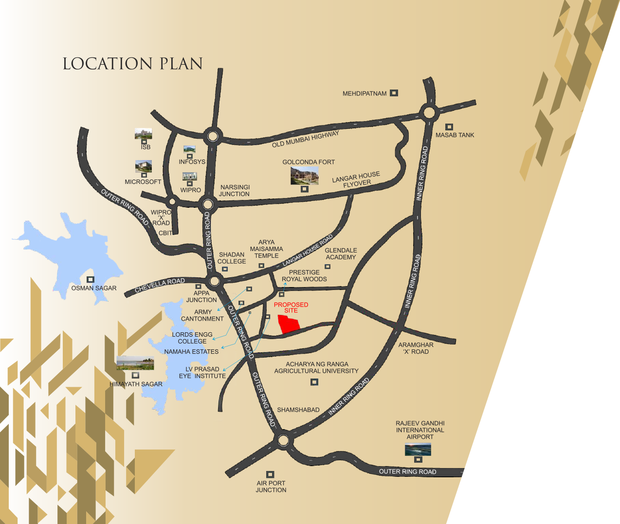 Triumph Villas' are situated at Kismatpura, one of the most picturesque areas of Hyderabad. A place where the chirping of birds sounds like a mellifluous background chorus to the rhapsody of nature. A place where the breeze caresses your face with a lover's touch and the golden sunshine enfolds you in a warm embrace. Greenery enfolds you on every side. Tall, verdant trees play host to a variety of birds. Nearby, a clutch of schools and colleges adom the neighbourhood. A galaxy of dhabas and restaurants and other hotspots of the city are just 2 km away ...